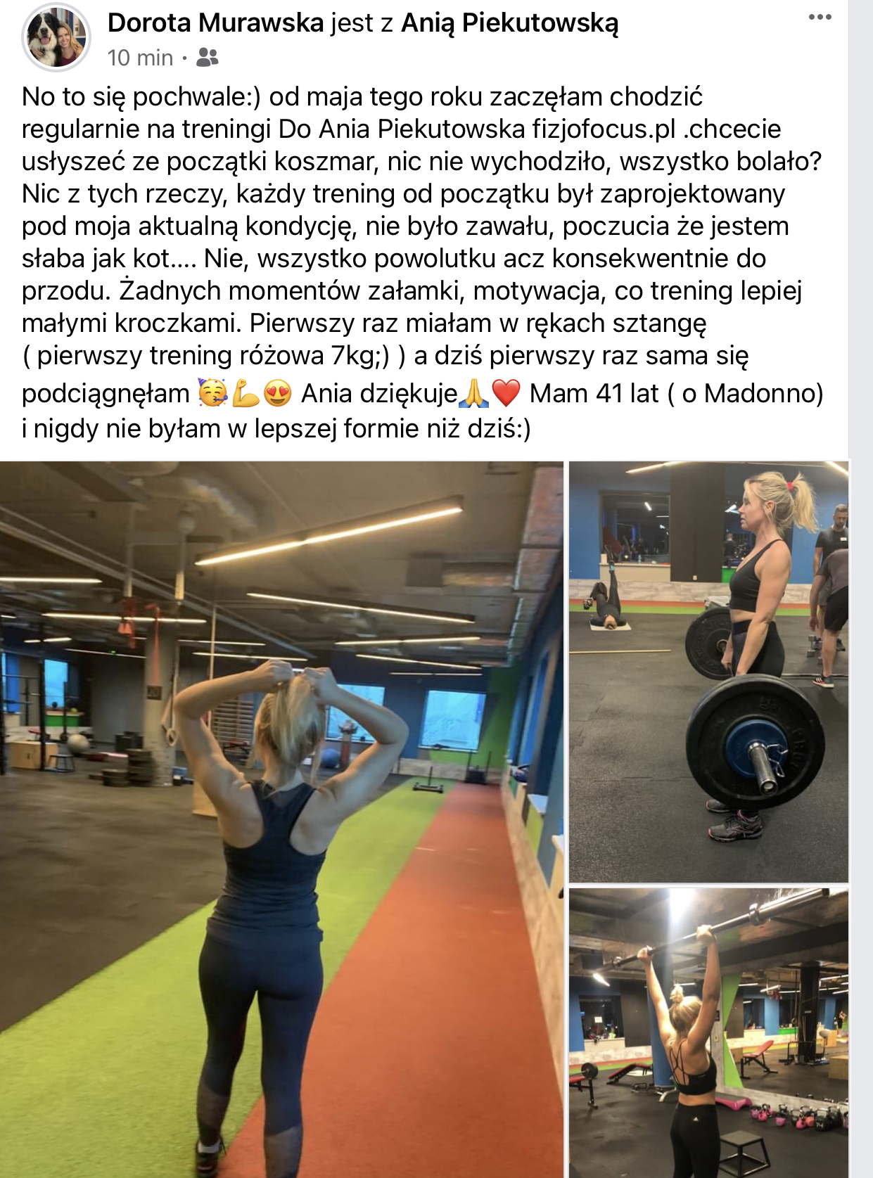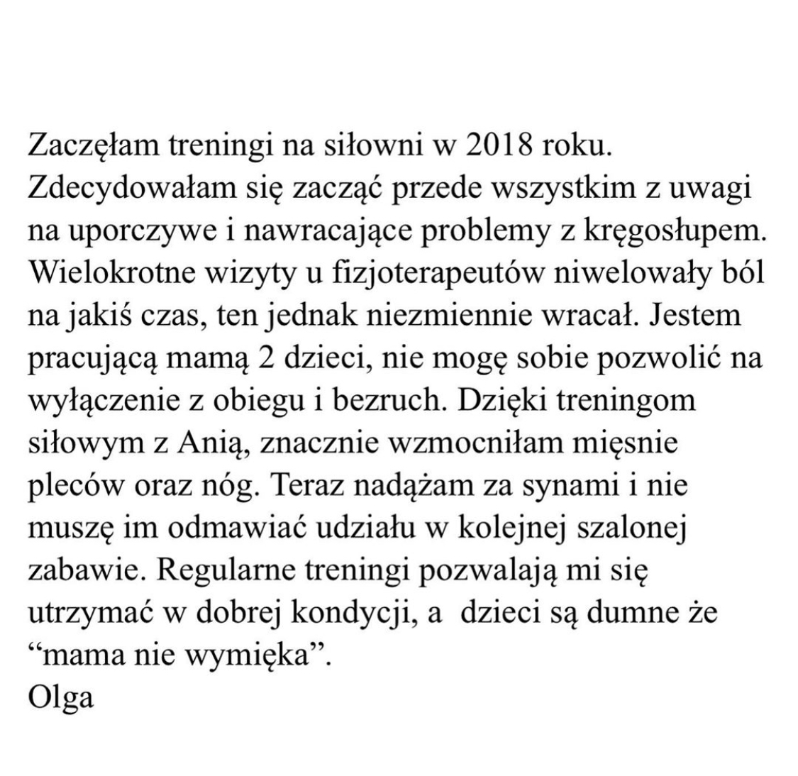 „Z Anią trenuję stosując równolegle zdrową dietę. Wspólnie udało nam się pozbyć ze mnie 16,6kg i odmłodzić metaboliczne o ponad 20 lat. Regularne treningi z Anią pozwoliły mi nie tylko poprawić sylwetkę i parametry, poczuć więcej energii na codzień ale też pokazały, że siłownia to ciekawa aktywność, pod warunkiem że trenuje się regularnie i świadomie - a taki styl propaguje właśnie Ania. Jako trenerka indywidualna, Ania jest perfekcjonistką w każdym calu. Niezwykle uważnie pilnuje prawidłowej postawy podczas ćwiczeń i natychmiast reaguje, gdy wzorzec odchyli się choćby o kilka milimetrów. Trening z Anią to 100% efektywnie wykorzystanego czasu. Nawet podczas przerw między seriami, Ania urozmaica trening cennymi radami z pogranicza dietetyki, chemii i zdrowego stylu życia. Na treningach z Anią zgubiłem już hektolitry potu, ale wzbogaciłem się o bezcenne doświadczenie i radość z trenowania:)” . Jeśli chcesz tak samo zrobić kawał dobrej roboty nad sobą napisz a ustalimy plan skutecznego działania !